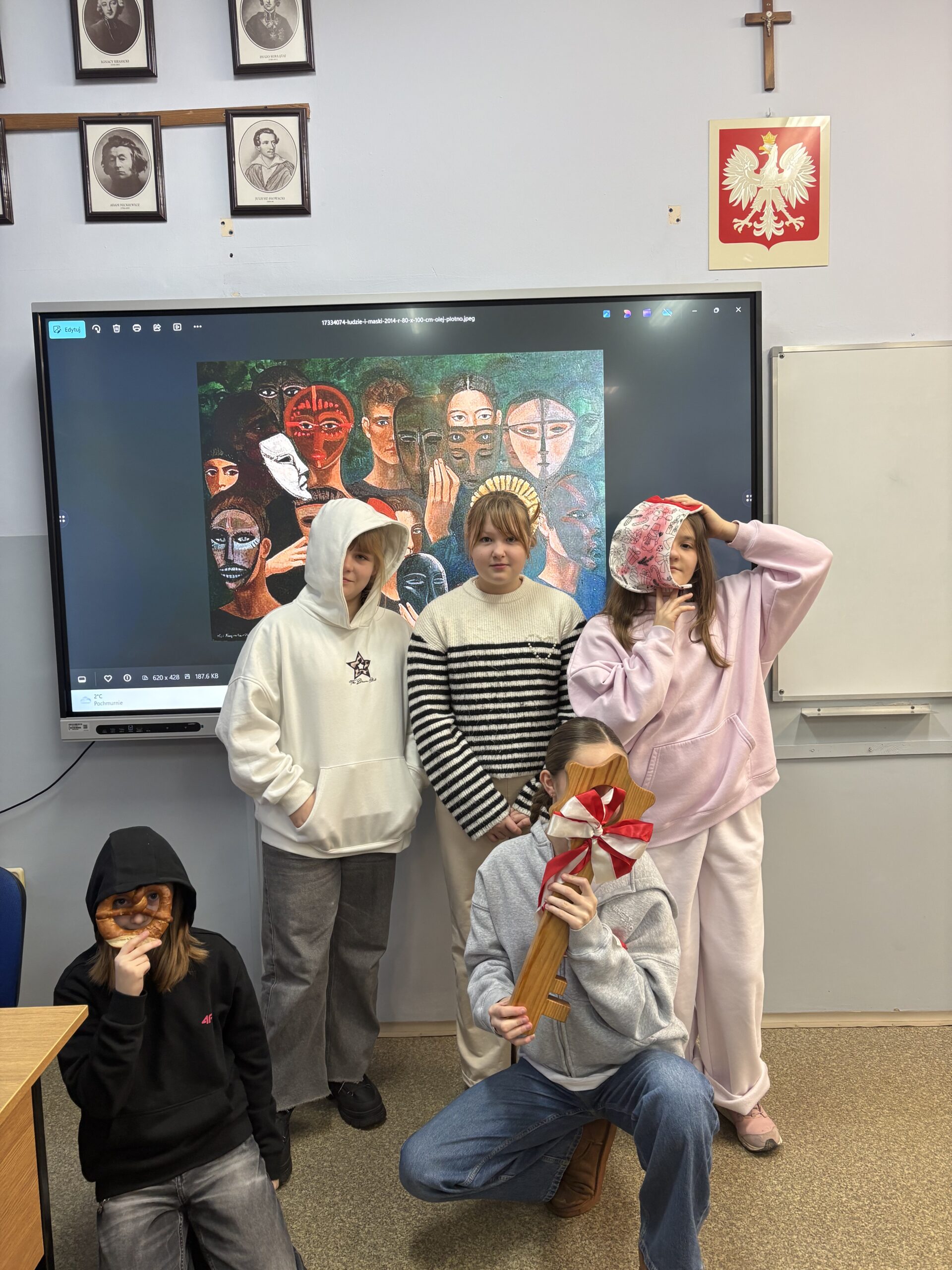 Na ostatnich zajęciach koła teatralnego uczennice pracowały nad różnymi formami ekspresji scenicznej. Jednym z ćwiczeń było „lustro”, polegające na uważnym naśladowaniu ruchów partnerki, co pozwalało ćwiczyć koncentrację i współpracę. Następnie uczestniczki improwizowały krótkie scenki, reagując na siebie nawzajem i budując sytuacje sceniczne bez wcześniej przygotowanego tekstu. Ważnym elementem zajęć było także odzwierciedlanie obrazów – tworzenie nieruchomych, teatralnych kadrów, takich jak ten widoczny na zdjęciu, w których liczyła się praca ciałem, relacje między postaciami i wyrażanie emocji. Czytaj dalej
